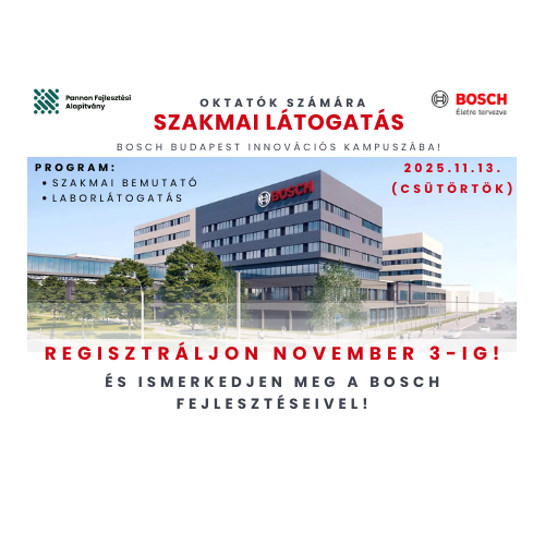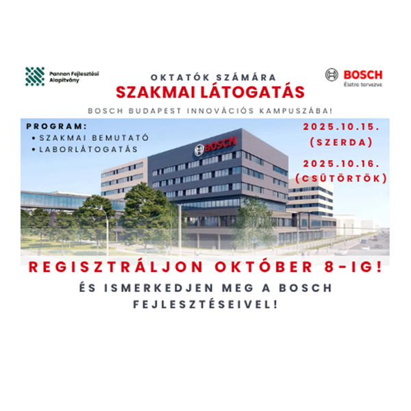 A Pannon Fejlesztési Alapítvány szakmai látogatást szervez a Robert Bosch Kft. Bosch Budapest Innovációs Kampuszába, amelyre gimnáziumok és technikumok oktatóit egyaránt várjuk sok szeretettel!