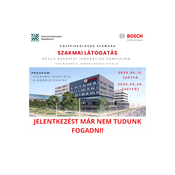 A Pannon Fejlesztési Alapítvány 2025. május 12-én (hétfőn) és május 26-án (hétfőn) szakmai látogatást szervez a Robert Bosch Kft. Bosch Budapest Innovációs Kampuszába, amelyre gimnáziumok és technikumok tanulóit egyaránt várjuk sok szeretettel!