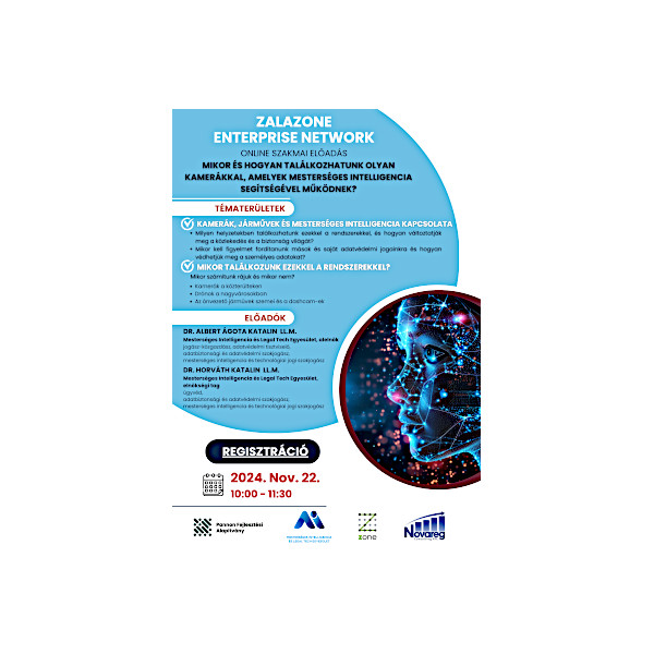 A ZalaZONE Enterprise Network (továbbiakban ZEN) program keretében online szakmai előadást szervezünk 2024. november 22 -én (péntek) az AI által vezérelt kamerákkal, adatvédelemmel, jogi kérdéssekkel kapcsolatosan.